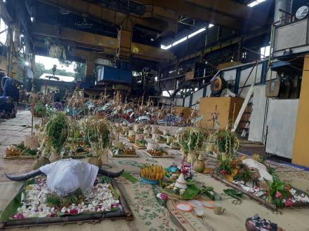 Selanjutnya, dilakukan prosesi pemendaman kepala kerbau oleh pimpinan perusahaan bersama Kepala Dinas Kebudayaan Bantul. Tradisi ini menjadi bagian dari ritual adat yang masih dijaga sebagai bentuk penghormatan terhadap nilai-nilai budaya dan kearifan lokal.