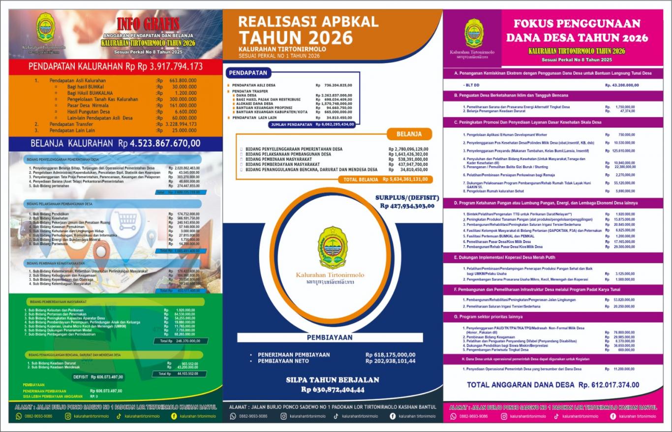 26 Agustus 2025 10:33:10 WIB AdministratorRabu, 20 Agustus 2025, Pemerintah Kalurahan Tirtonirmolo mengadakan rapat koordinasi final dalam rangka menyambut kedatangan tim juri nasional Lomba Desa Berkinerja Baik dalam Penurunan Stunting. Pertemuan yang berlangsung di Kalurahan Tirtonirmolo ini dihadiri oleh Dinas Pemberdayaan Masyarakat dan... ..selengkapnya